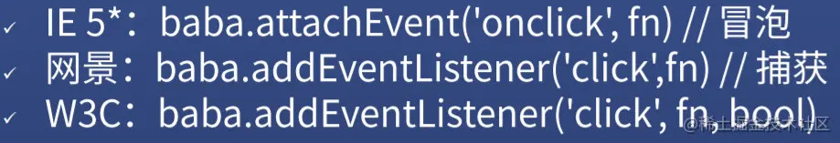 IE9以下的IE浏览器不支持 addEventListener()和removeEventListener(),使用 attachEvent()与detachEvent() 代替,因为IE9以下是不支持事件捕获的,所以也没有第三个参数,第一个事件名称前要加on。