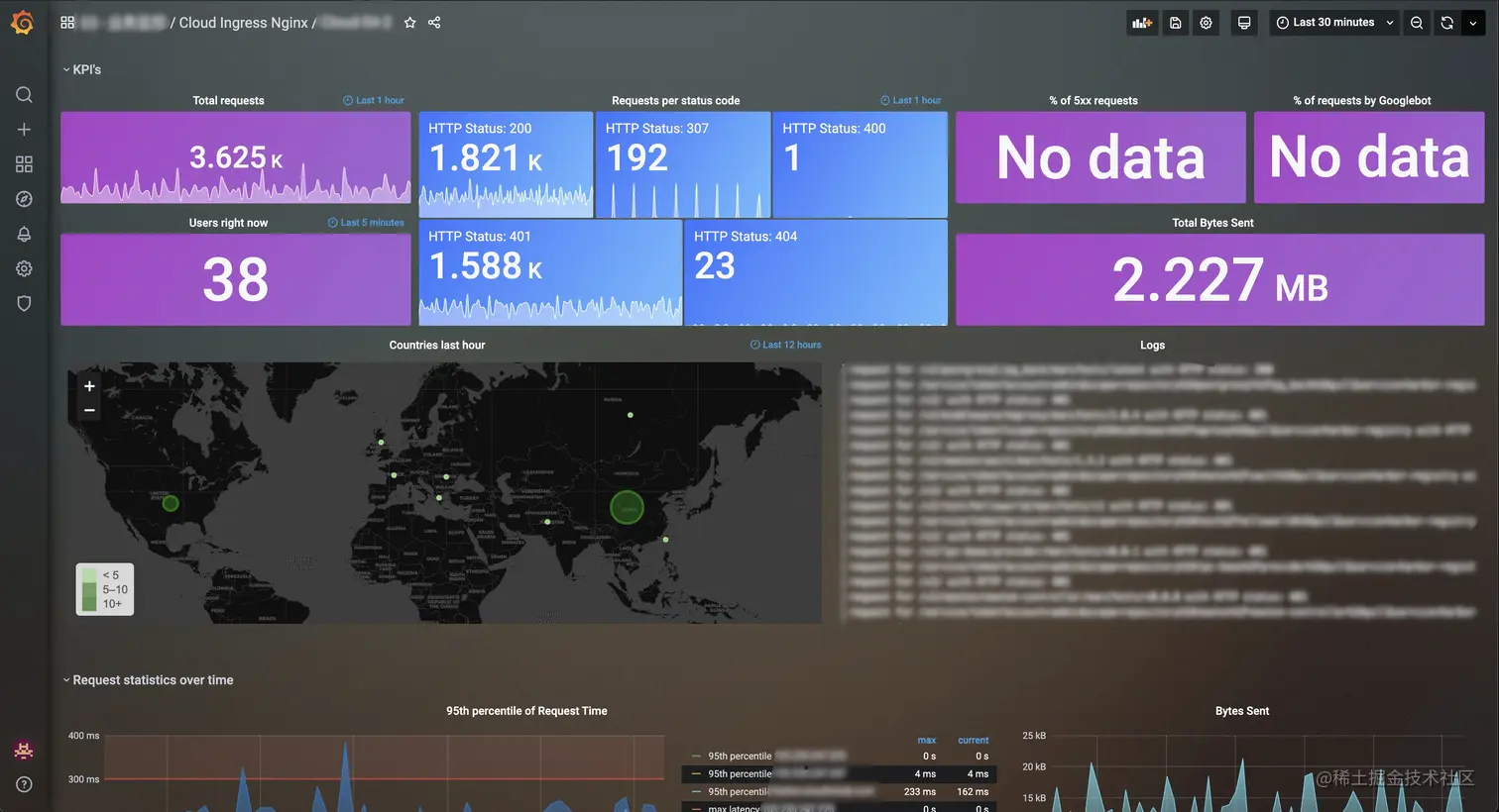 编辑一个Panel,将原本LogQL语句中的filename=/var/log/nginx/json_access.log调整为你自己Loki中对应的ingress-nginx日志标签即可,这样你就可以得到如下的大屏了。