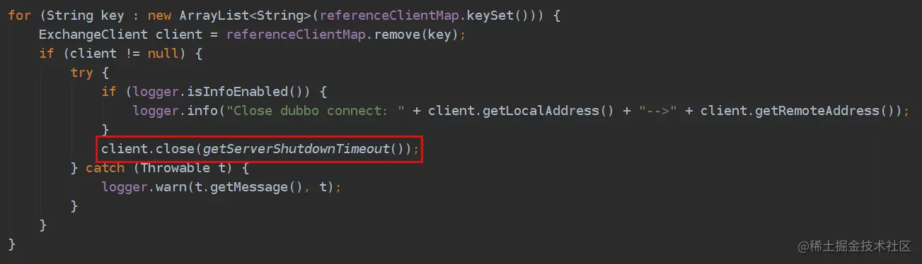 DubboProtocol.destroy()方法中,当provider对外关闭暴露并且已有任务执行完成之后,理论上此时可以立即关闭consumer,即代码中的client.close(),因为既然上游服务的调用已全部处理完成、且不再有新的调用过来,那么理论上此时下游的服务也已经执行完成。