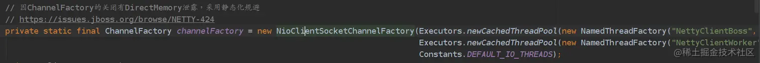 上面是为netty创建boss线程池和worker线程池。注释里提到了一个netty内存泄露的bug,在大量创建和关闭channelFactory时会引起堆外内存的大量泄露,从而引发OOM。