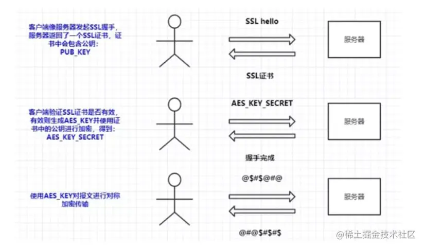 其实SSL协议大致就和上一节非对称加密的性质一样,握手的过程中主要也是为了交换秘钥,然后再通讯过程中使用对称加密进行通讯,大概流程如下: