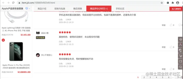 本文实现的爬虫是抓取京东商城指定苹果手机的评论信息。使用 requests 抓取手机评论 API 信息,然后通过 json 模块的相应 API 将返回的 JSON 格式的字符串转换为 JSON 对象,并提取其中感兴趣的信息。读者可以点击此处打开 京东商城,如下图所示: