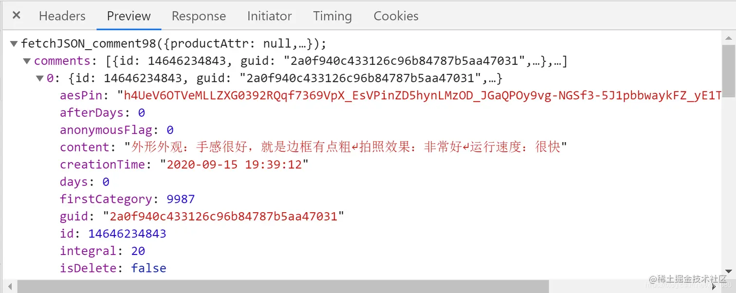 在搜索结果中会看到 1个名为 productPageComments.action 的 URL ,单机这个 URL,在右侧切换到 Preview 选项卡,会看到如上图所示的内容,很明显,这是 JSON 格式的数据,展开 comments ,会看到有 10 项 ,这是返回的 10 条评论。在展开某一条评论,如下图所示: