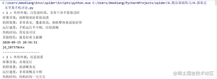 根据前面的描述实现抓取苹果手机评论信息的爬虫,通过 fetch_comment_count 变量可以控制抓取的评论条数。最后将抓取的结果显示在控制台中。示例代码如下: