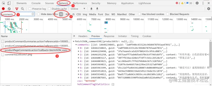 所以重新选中 All 按钮,显示所有的 URL。现在用另外一种方式寻找这个 URL,就是 Filter。通过左上角的 Filter 输入框,可以通过关键字搜索 URL,由于本文是抓取评论数据,所以可以尝试输入 comments,在左下角的列表中会出现如下图所示的内容。