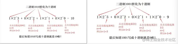 从左边第一位数乘以2的n-次方(幂),n代表该数字从右到左数起的位数。加上从左边第二位数乘以2的n-1,加上从左边第三位 ,第四位...等等 一直到最后一个数。看图: