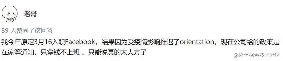 面对这次疫情,FB 给每个员工发放了1000美元的奖金补助!原本每年两次的考评,也取消了年中的performance review,所有人都得优,只进行一次年底考评。