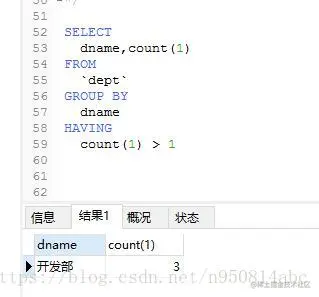 查询出:根据dname分组,同时满足having字句中组条件表达式(重复次数大于1)的那些组