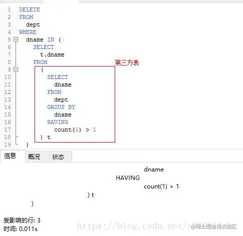 3. 查询表中多余重复试题(根据depno来判断,除了rowid最小的一个)