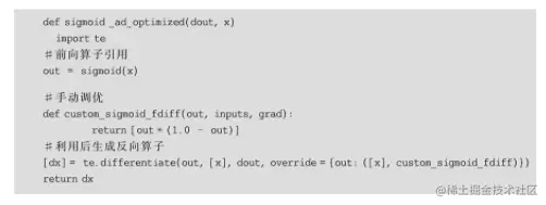 但是对部分有更高性能或者代码部署要求的用户,MindSpore提供接口让用户可以用自己优化过的导数公式代替某一步或者若干步自动生成的微分,如代码1.4所示。虽然上面的例子中MindSpore业已完成Sigmoid函数的求导,但部分用户可能希望用手动推导的Sigmoid函数的导数dy=y(1-y)进行计算,这样可以利用前向函数计算的结果。这里把手动推导的导数公式放入函数custom_sigmoid_fdiff中,并在自动微分中重载这部分的求导。那么自动微分在保持其他部分自动生成的情况下,使用custom_sigmoid_fdiff作为输出对于x的导数进行运算。这样MindSpore保持了自动微分和手动调优的反向算子在风格上的统一,方便了图层对算子的调用。