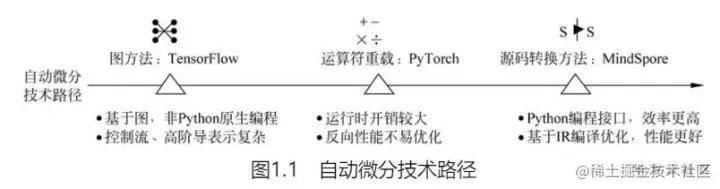 编程简单MindSpore函数式可微分编程架构可以让用户聚焦模型算法数学原生表达。**资深的深度学习开发者都体会过手动求解的过程,不仅求导过程复杂,结果还很容易出错。**所以现有深度学习框架,都有自动微分的特性,帮助开发者利用自动微分技术实现自动求导,解决这个复杂、关键的过程。深度学习框架的自动微分技术根据实现原理的不同,分为以Google的TensorFlow为代表的图方法,以Facebook的PyTorch为代表的运算符重载,以及以MindSpore为代表的源码转换方法(Source to Source,S2S自动微分技术),如图1.1所示。