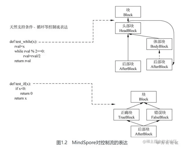其次,IR(Intermediate Representation,中间表示)粒度的可微分技术能够把用户定义的网络源代码通过解析验证等过程转换为MindSpore定义的IR,也就是MindSpore IR,在IR的基础上应用IR更变器方法(IR Mutator Method),最终生成反向代码。在此过程中,也应用了算子融合等技术进一步提升反向性能。如图1.2所示,MindSpore对控制流的表达包括循环和条件。可以看到代码编程风格与原生Python保持一致,更重要的是,与Python对控制流的表达不同的是,MindSpore在生成控制流的反向时不会对循环进行展开,而通过在IR基础上进行反向计算,避免了表达式膨胀,从而提升性能。