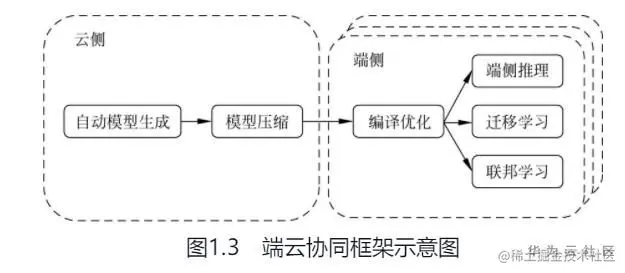 由于端侧设备在算力、电量和数据量方面的限制,从头训练一个模型不切实际,因此迁移学习技术被用在了端侧学习中,可以大幅度降低端侧训练的难度。为了充分利用端侧数据和端侧训练能力,一些端云联合学习方法和框架被提出来,旨在联合多个端侧设备共同训练一个全局模型,并实现端侧隐私保护。Google率先于2016年提出了联邦学习方法和框架。杨强等又提出了横向联邦学习、纵向联邦学习、联邦迁移学习以及联邦强化学习等方法及对应的框架。端侧推理、迁移学习和联邦学习属于端云协同的不同阶段,如图1.3所示的MindSpore端云协同框架融合了这三种形态并打通了云到端全流程。