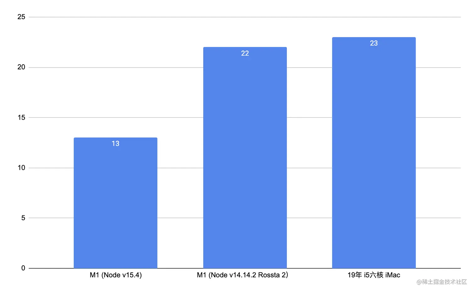 - 在M1 Macbook Pro下用最新的Node lts版本 v14.15.2, Rosseta 2运行,需要22s,居然和桌面U打平