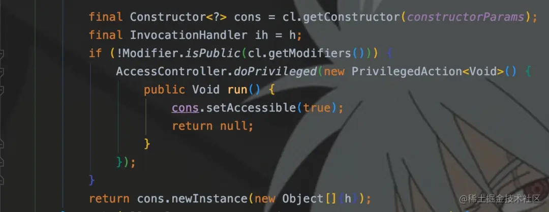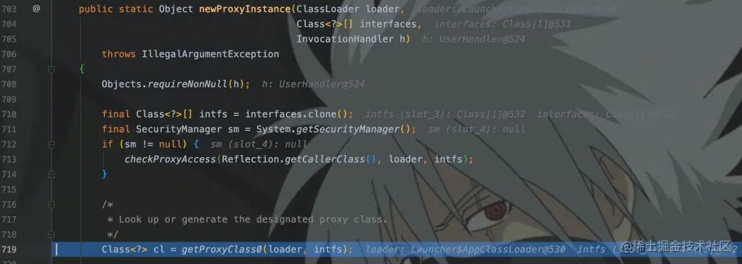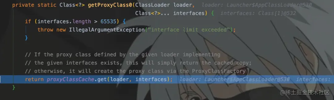 newProxyInstance()上半部分经过上面层层代码调用,获取了$Proxy0.class,接下来看下部分代码: