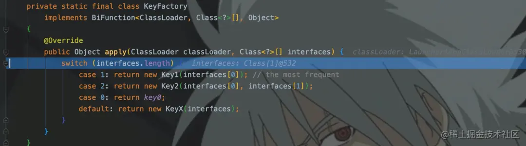 刚开始看可能比较绕,跟着注释及跳转指引,耐心多看两遍就明白了。动态代理涉及的知识点比较多,我自己看的时候,在WeakCache这一块纠结了一阵,其实把它当成一个两层的map对待即可,只不过里面所有的KV都被弱引用包装。