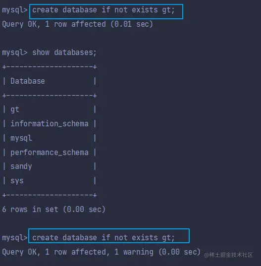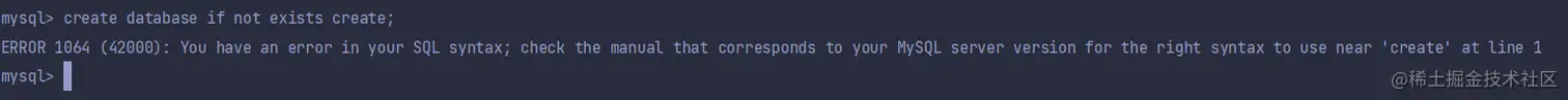 以上语句,如果MySQL中已经存在了你想要创建的数据库, 并不会报错, 而是跳过这条语句
