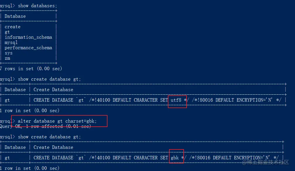 alter database 数据库名称 charset=字符集;