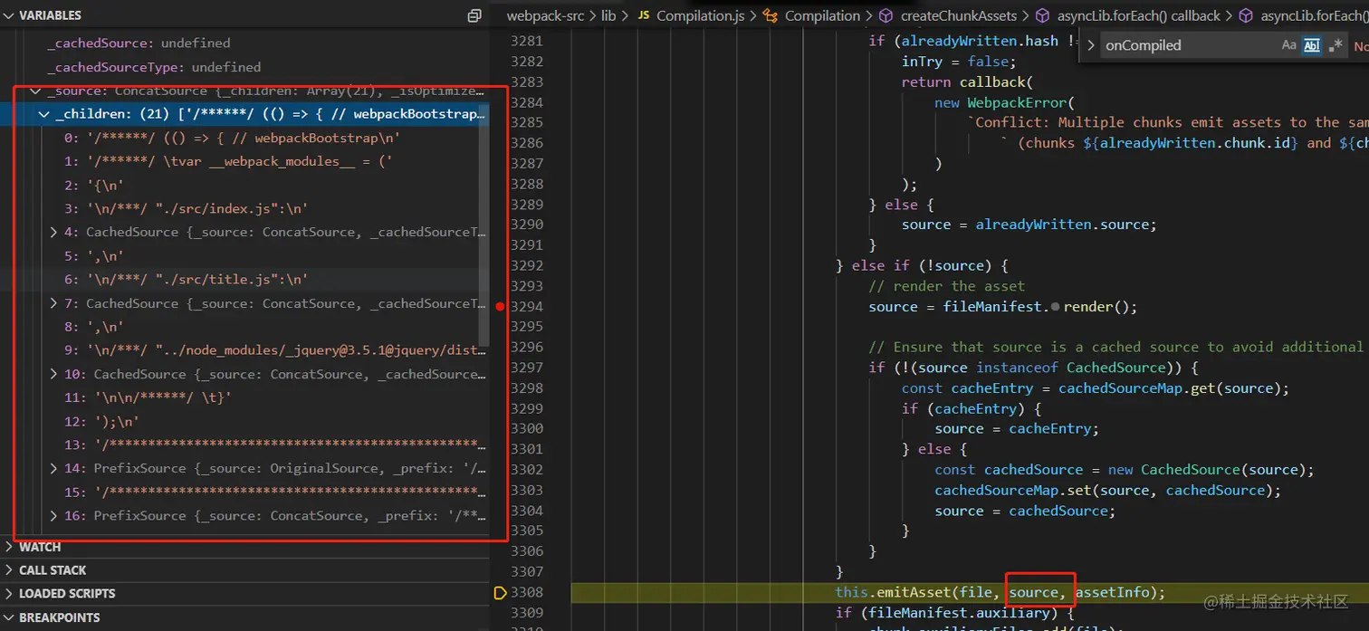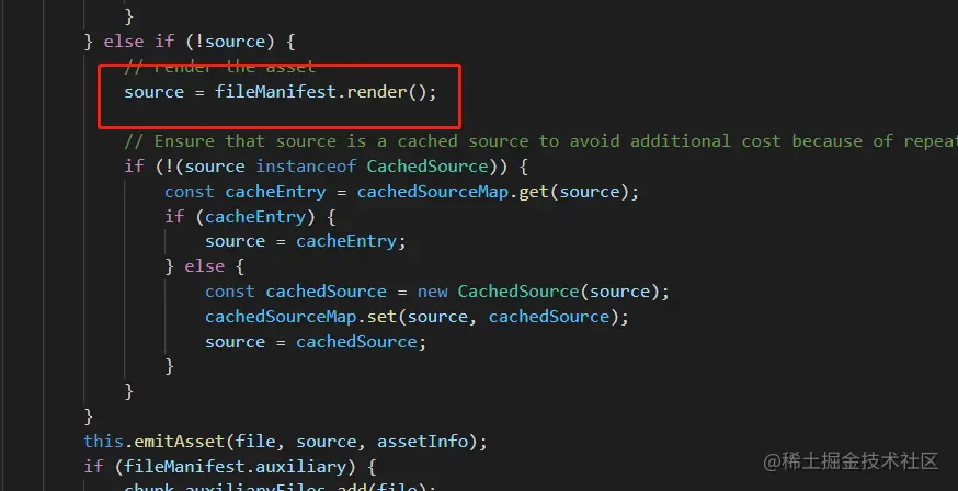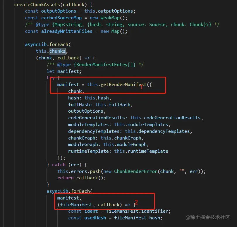 createChunkAssets方法遍历chunks生成manifest数组,每个数组元素上面都有render方法,下面遍历manifest,执行里面的render方法会拼接成我们打包输出的文件的source