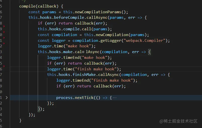 首先执行了this.hooks.beforeRun.callAsync()这个钩子,我拿这个方法举例说明webpack里面的事件流的具体实现。