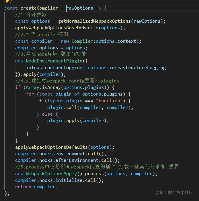 createCompiler方法就是拿到我们webpack.config中的配置的参数然后开始进行的不走就是上面所显示的,具体的compiler类上的属性跟方法就不过多赘述,后面重要的会出现。其中比较重要的是第五步,会挂载很多钩子然后在compiler的事件流里面触发,比较重要的是跟后面相关的make编辑的钩子,这里先留个悬念。至此我们拿到了compiler对象,完成了初始化阶段。