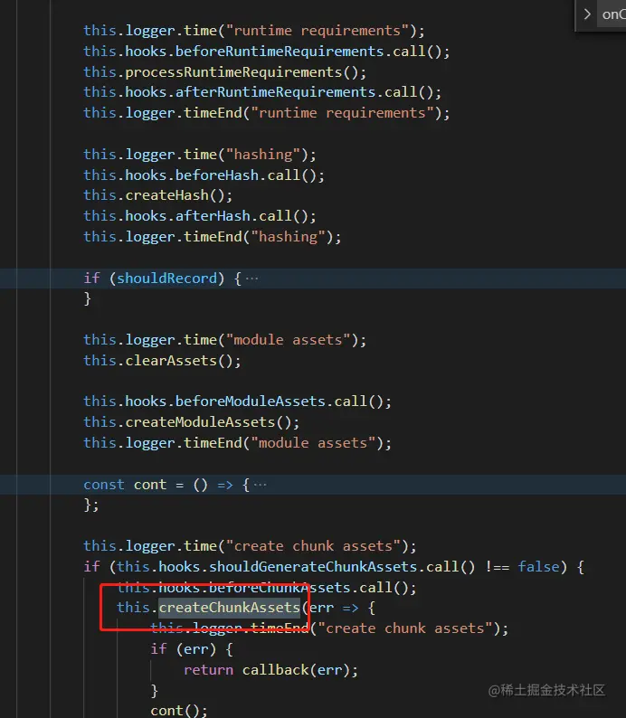 seal方法中实现了很多优化比如dependencies,module,还生成了本次编译的chunk和hash值等,最终来到了this.createChunkAssets方法