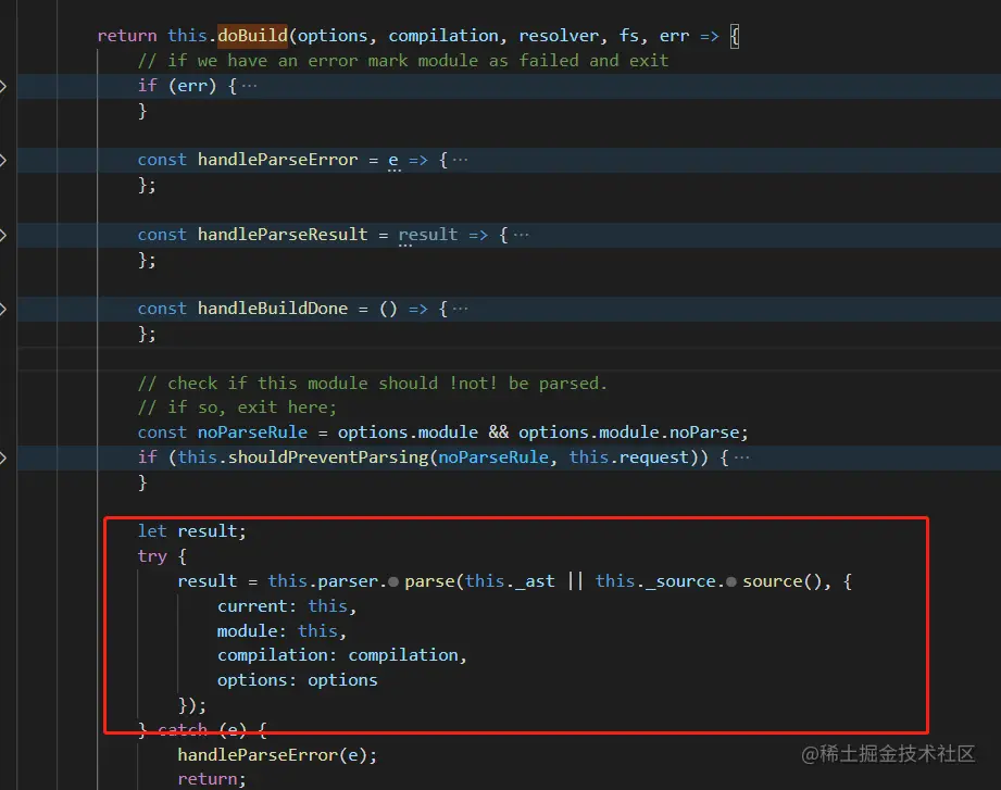 根据addEntry方法一步步往下debug,=> compilation._addEntryItem => compilation.addModuleChain => compilation.handleModuleCreation =>this.addModule=>this.buildModule=>module.build,最终会走到NormalModule对象(./lib/NormalModule.js)中,执行build方法,首先会先执行doBuild方法