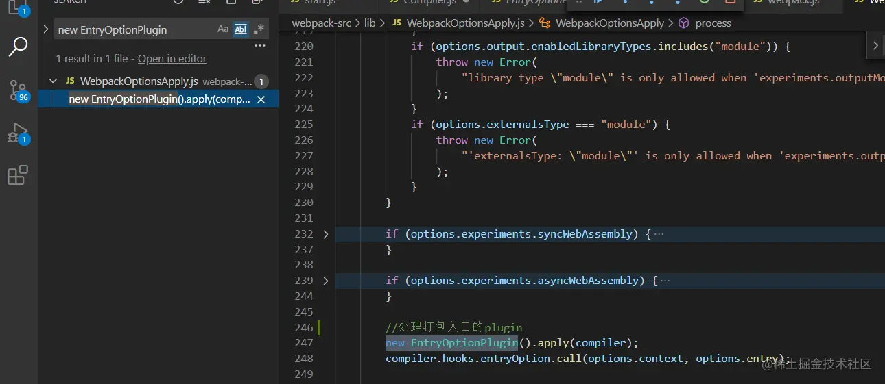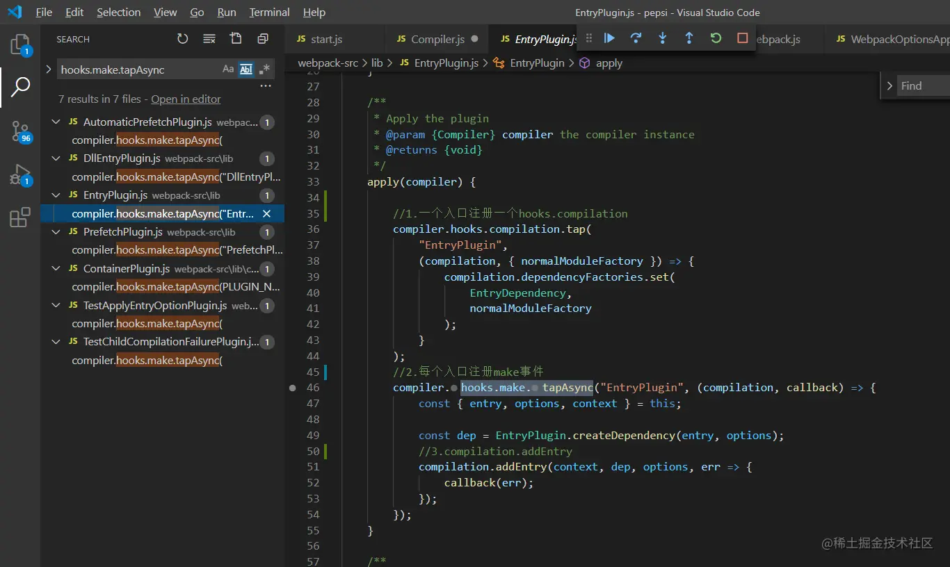 出现在EntryPlugin.js,根据new EntryPlugin网上找找到了EntryOptionPlugin.js,再往上找,找到了在初始化的时候留的悬念,我们在挂载很多plugin的时候在compiler.hooks.make上注册一个编译事件。如上图,EntryPlugin.js最重要的是拿到compilation对象,执行compilation.addEntry开始添加入口文件编译。