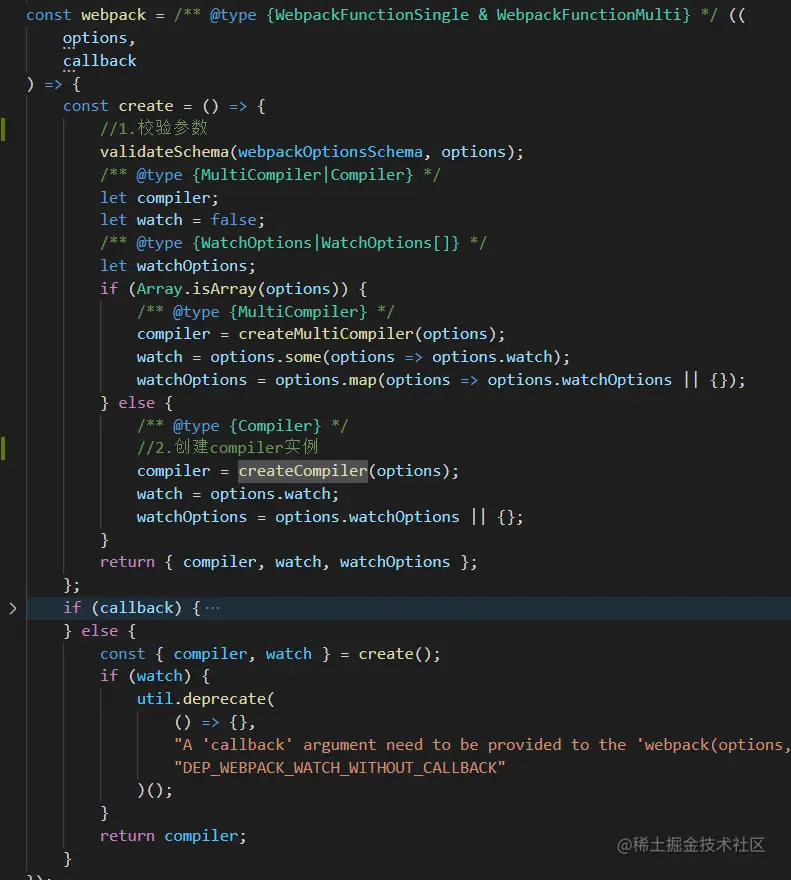 源码中初始化会先进lib/index.js,随后进入到lib/webpack.js执行他的create()方法并返回compiler对象,compiler是我们在打包之后仅此一个的。