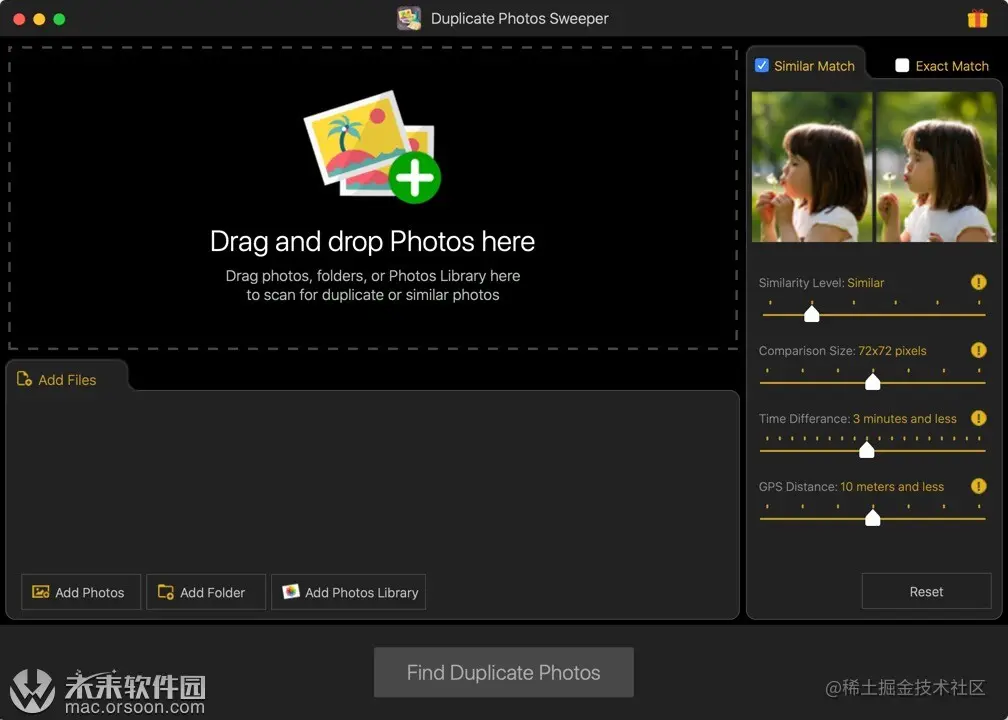 重复和类似的照片可能会占用Mac上的大容量存储空间,您甚至可能不知道它们所占用的不必要空间。以照片形式存储的记忆是无价的,但是重复的照片会使您的照片集混乱。这些照片可能散落在Mac系统上的各个文件夹中。从Mac手动定位和删除此类重复的照片可能是一项繁琐的工作。Duplicate Photos Sweeper是终极的Duplicate Photos Finder,它可以帮助您查找所有重复的照片甚至相似的照片,并轻松地将它们删除以进行有组织的照片收集并重新获得宝贵的空间。在搜索“完全匹配”时,它还会在Mac系统上搜索“重复视频”。重复照片扫描程序还可以帮助您消除外部存储设备中的重复照片。