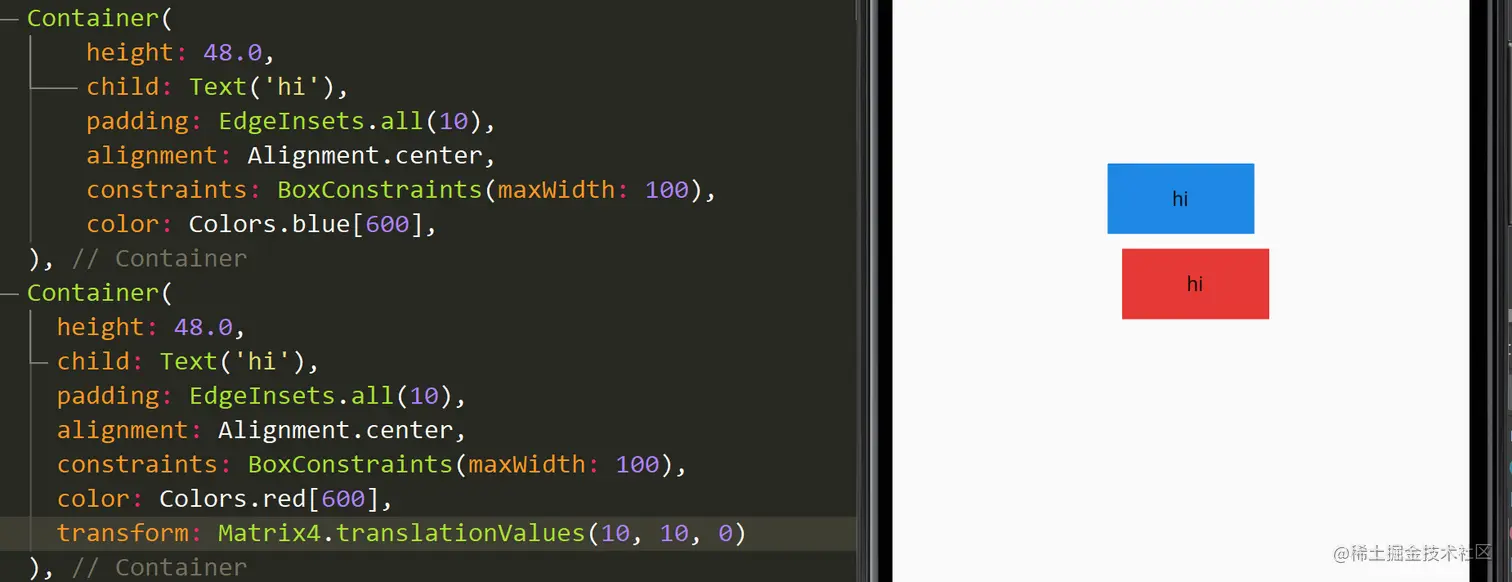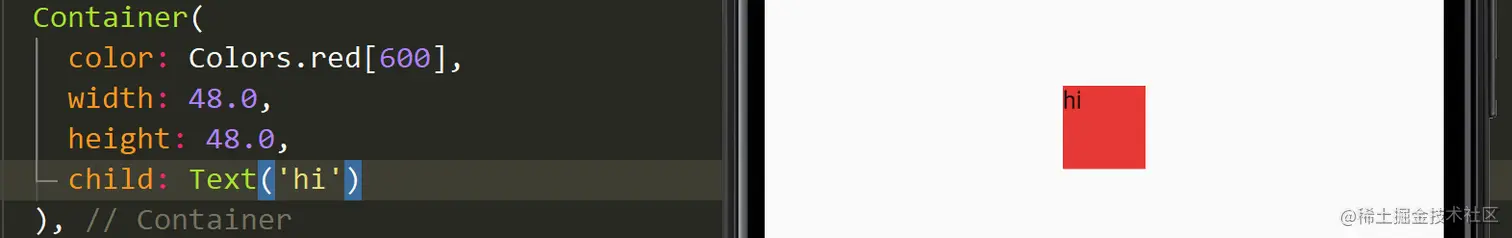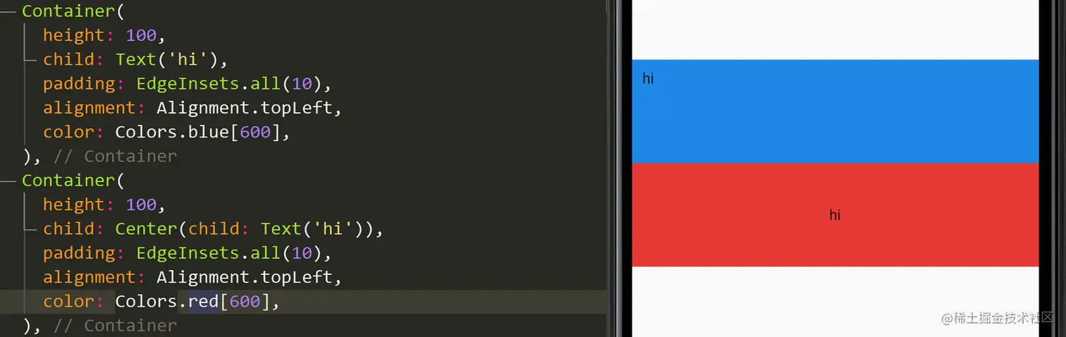 其中 Color(0x99ff0000) 里面的 99 是不透明度。如果把 99 改成 ff,已经就是完全不透明,那么 hi 就看不见了。