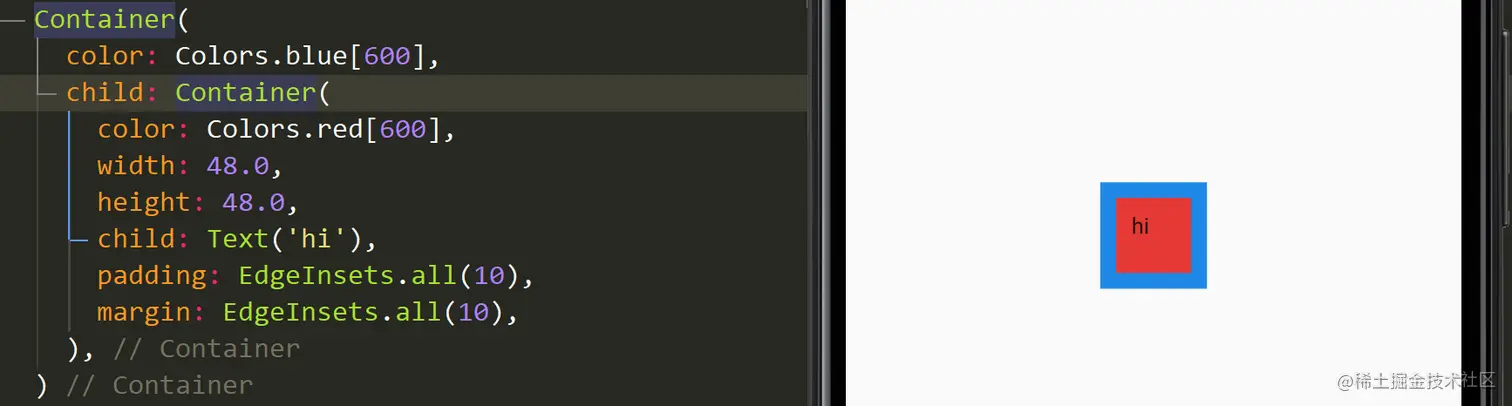 如果 Container 即指定了 padding 又指定了 margin,flutter 会使用两层 Padding 部件来实现,即 Container = Padding > Padding > Child,外面的 Padding 部件表示 margin,里面的 Padding 部件表示 padding。