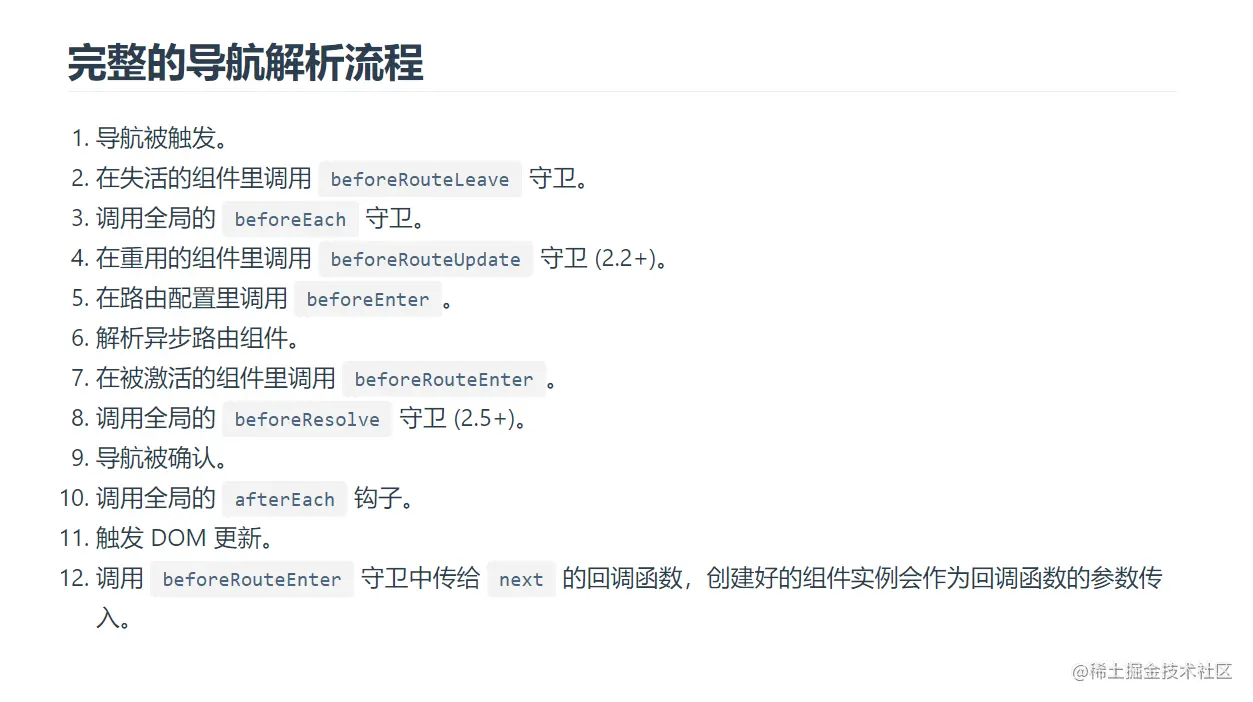 具体实现:全局前置守卫(beforeEach、beforeResolve、afterEach)、路由独享守卫(beforeEnter)、组件内守卫(beforeRouteEnter、beforeRouteUpdate、beforeRouteLeave)