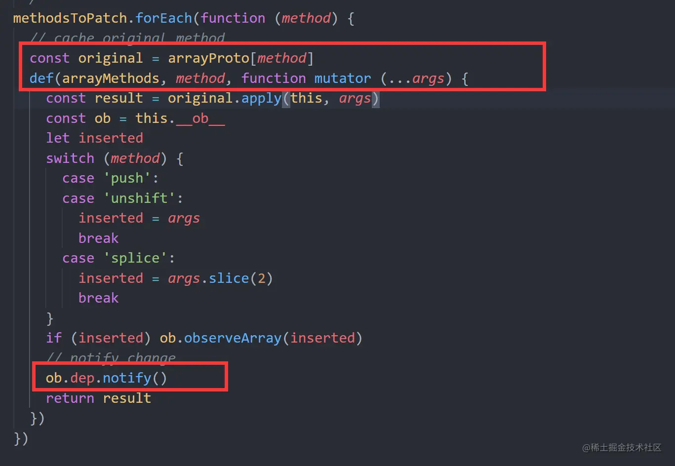 how:根据不同的类型做不同的处理,如果是对象则采用Object.defineProperty定义数据拦截,如果是数组,则通过覆盖数组原型的方法,扩展7个可以改变数组长度的方法,使得这些方法做额外的更新通知。可能存在的问题:递归初始化会导致性能损失;新增的属性需要$set特殊处理;对于Set、Map等新数据机构不支持