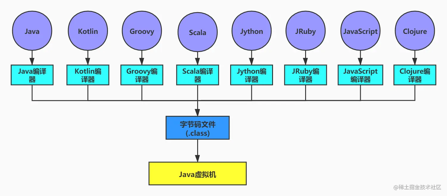 - 当Java源代码成功编译成字节码后,如果想在不同的平台上面运行,则无须再次编译