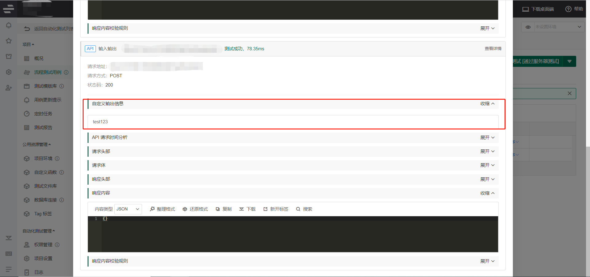 创建后的流程用例如下图所示,点击左上角测试按钮进行测试。