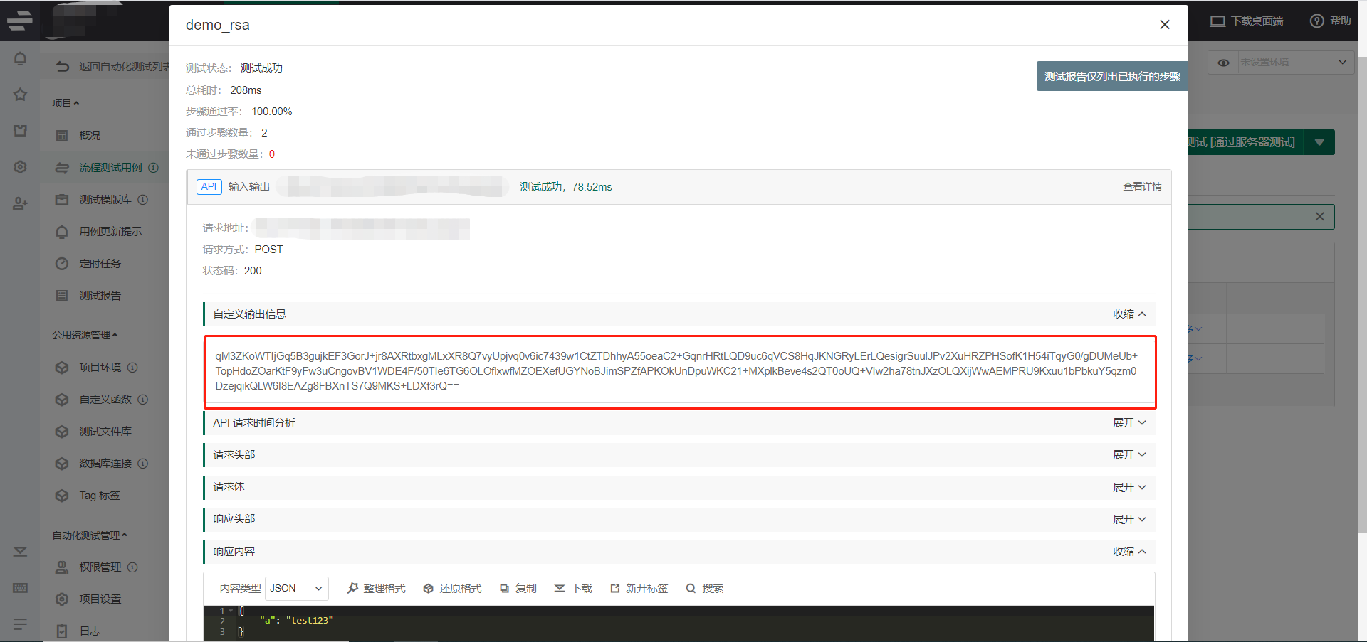 测试完成,即可查看报告。我们可以在报告看到第一个测试步骤正常对数据进行了加密处理并输出加密后的信息。