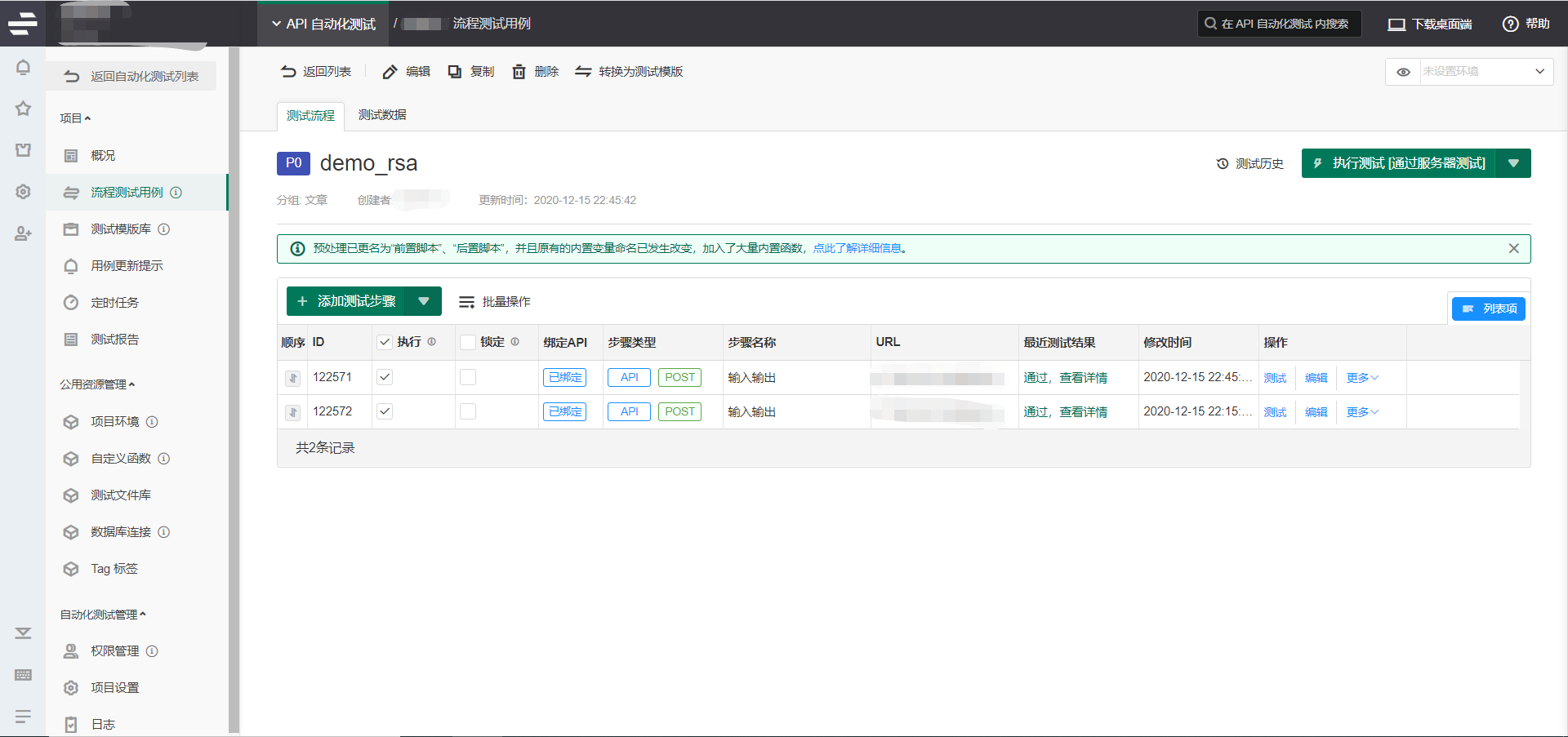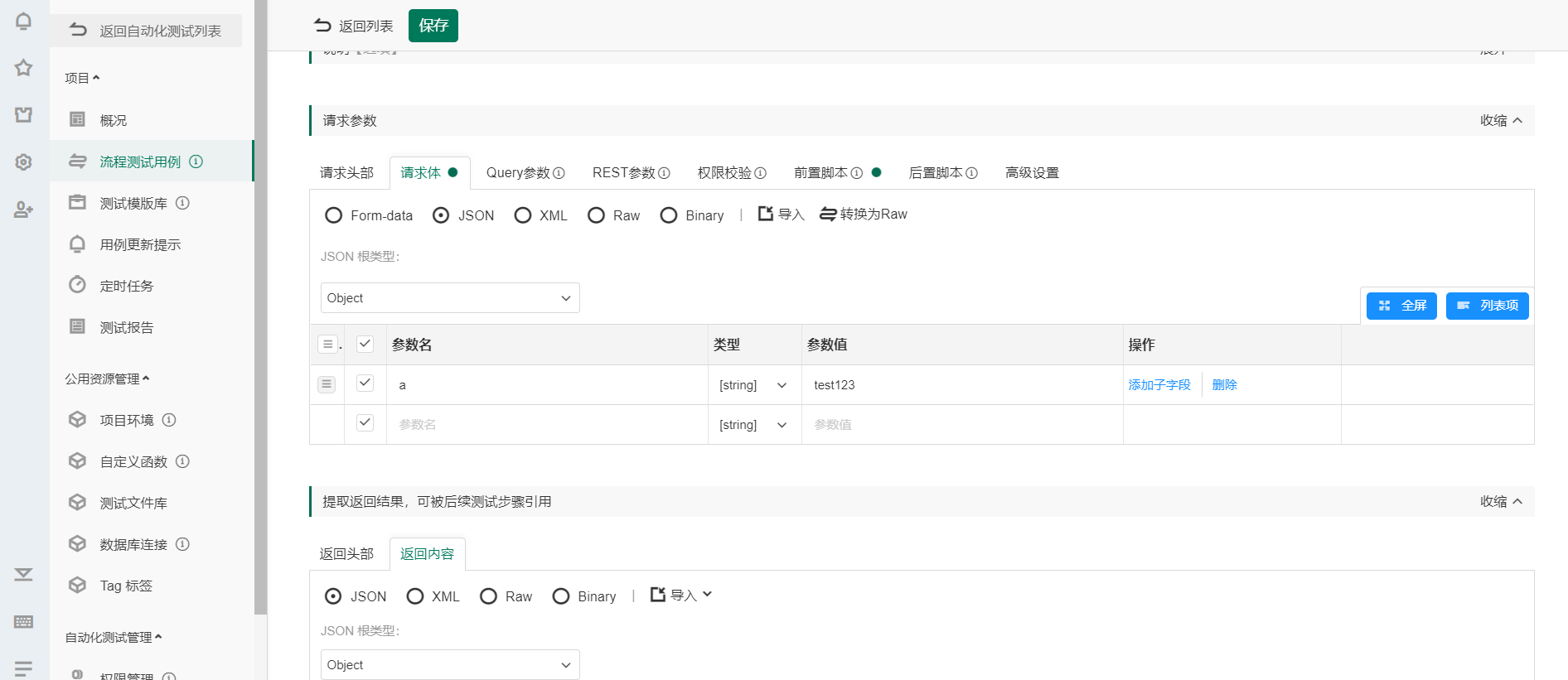 首先我们在Eolinker的自动化测试中创建一个流程测试用例,里面有两个测试步骤,在第一个步骤中,请求体填写需要加密的参数。