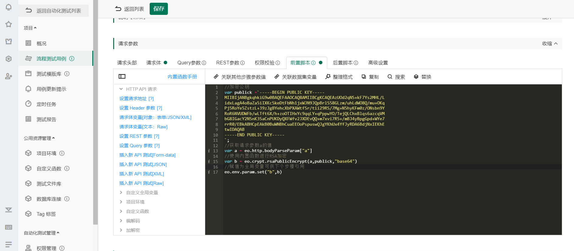 按需求在前置脚本或后置脚本,编写加密脚本。获取请求参数的值,进行加密后赋值为全局变量可供下个步骤使用。这里的公私钥可自己生成或在网上工具生成。