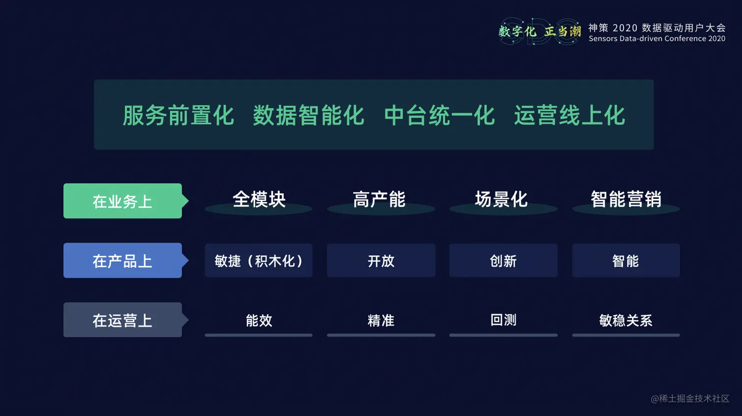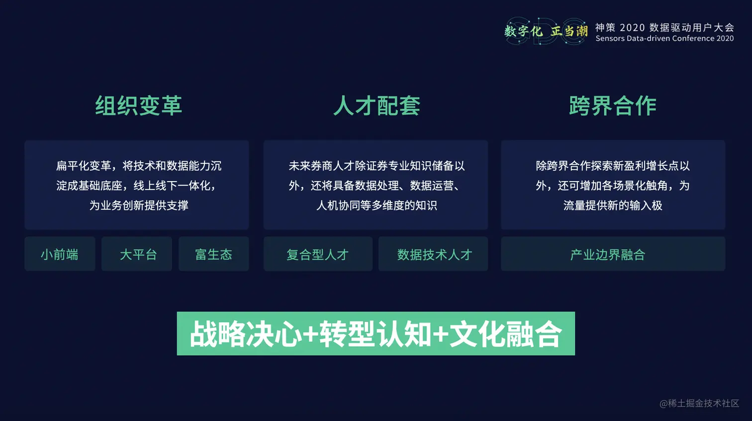 在硬性策略方面,分为三点:第一,IT 技术建设是基础,怎样把相关需求云化、服务化,搭建一个高效的 IT 服务平台,这是所有数字化都需要去夯实的基础;第二,数字化人才储备,在数字化转型过程中,承接业务的同时增强数字化意识;第三,数据储备,除了企业内部本身的数据治理之外,是否需要链接外部数据,形成客户源的整体数字化等。