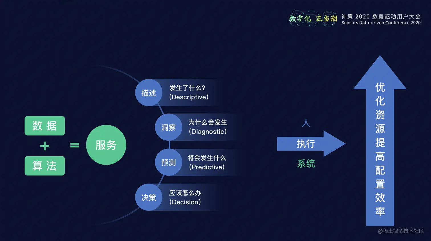 其实,从基建到用户连接,到用户在线,再到积累数字,最后再到我们这种模式的分析并生成数字化的营销策略,整体是一个科学化的数字化决策链路。 因此我们可以说,数字化本质上是一场关于决策的革命,它的核心是数据,通过数据 + 算法形成服务,去解决“发生了什么”“为什么发生”“预测将会发生什么”以及“如何科学决策”的问题。