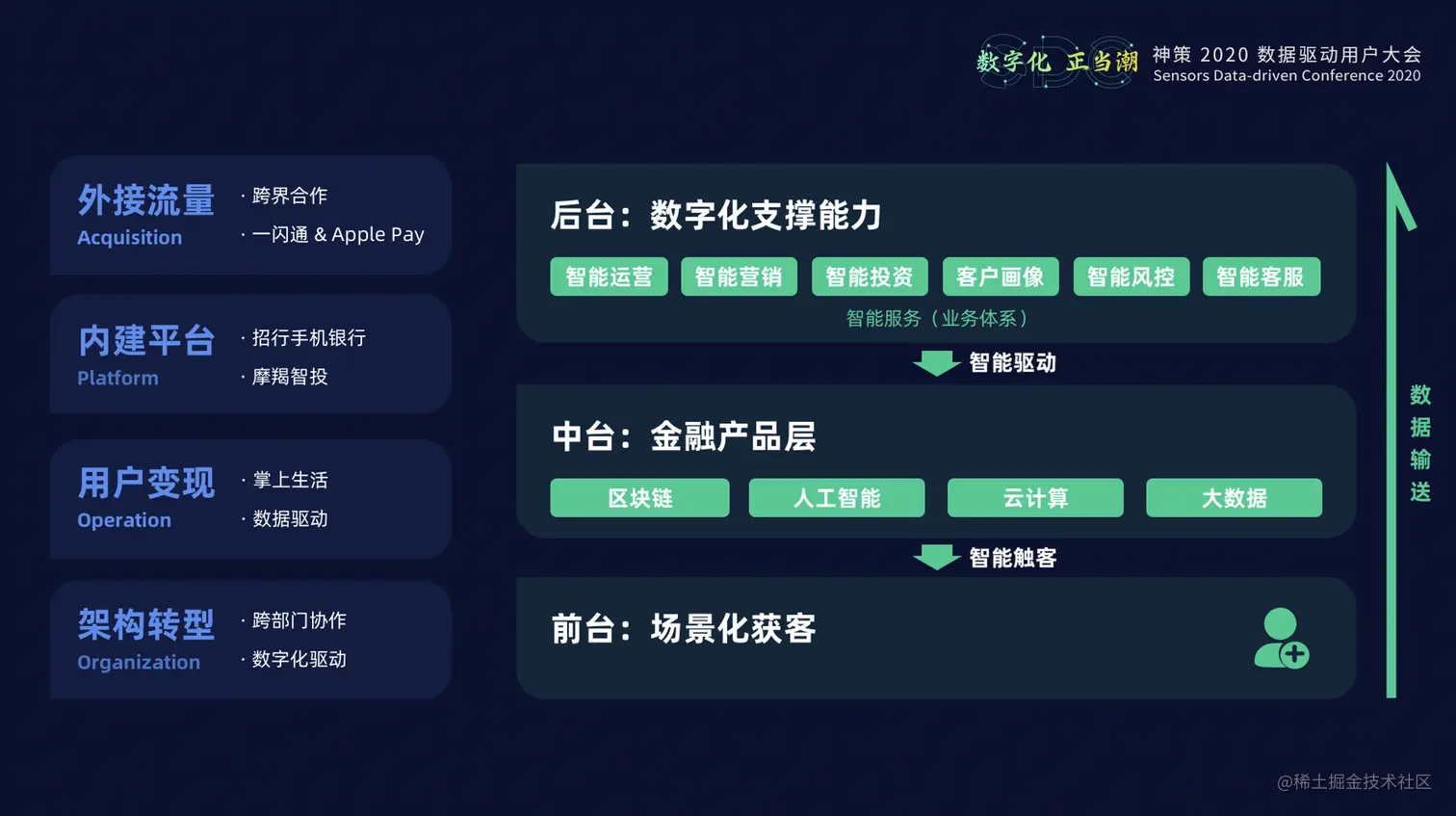 在此基础之上,通过后台强优化的数据支撑,驱动中台金融产品,然后再通过场景化获客形成数字化闭环。