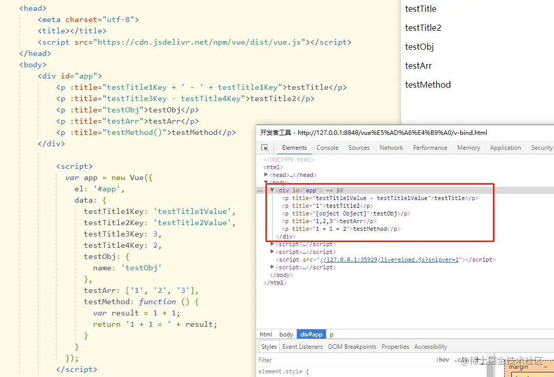 - testMethod 为一个方法,渲染出方法的返回值! 然后分别通过v-bind指令绑定到了P标签的title属性,进行渲染!