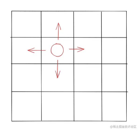 显然,我们的小球能够往上下左右四个方向进行查找,而边界则是最外面的栅格。