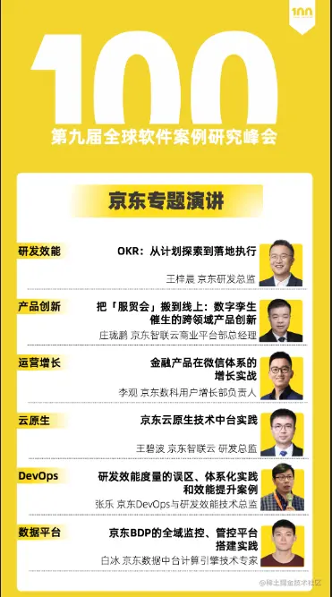 在今年最具代表的 TOP100 中,京东共入选 6 个案例,涉及研发效能、产品创新、运营增长、云原生、DevOps、数据平台等多个领域。 其中,京东智联云提交的 3 个案例从众多海选案例中脱颖而出,为大家带来云上服贸会、研发效能度量、云原生等前沿技术的最佳落地实践 。更令人兴奋的是,来自京东智联云的三位技术大咖,将在峰会中现场揭秘案例背后的探索历程与实践心得。