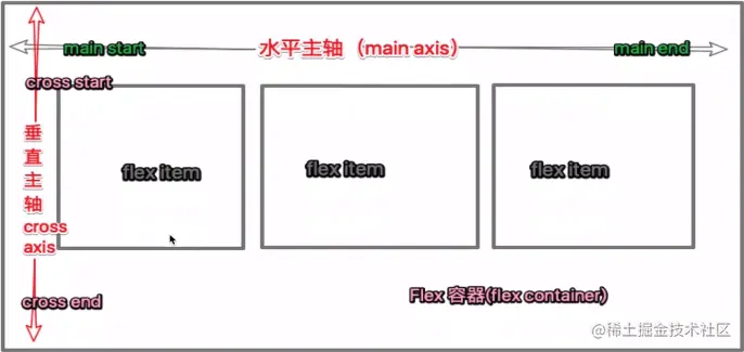 容器默认存在两根轴:水平主轴和水平交叉轴。水平主轴的开始位置如图所示为main start,结束位置叫做main end;交叉轴的开始位置为cross start,结束位置为cross end。项目默认沿主轴排列。