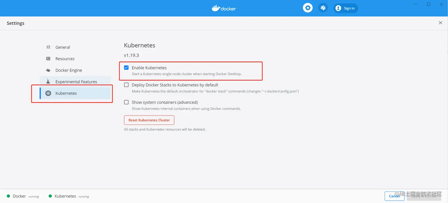 然后打开设置之后最下面有一个k8s,将第一个勾选上,然后就等待即可非常方便地部署了k8s