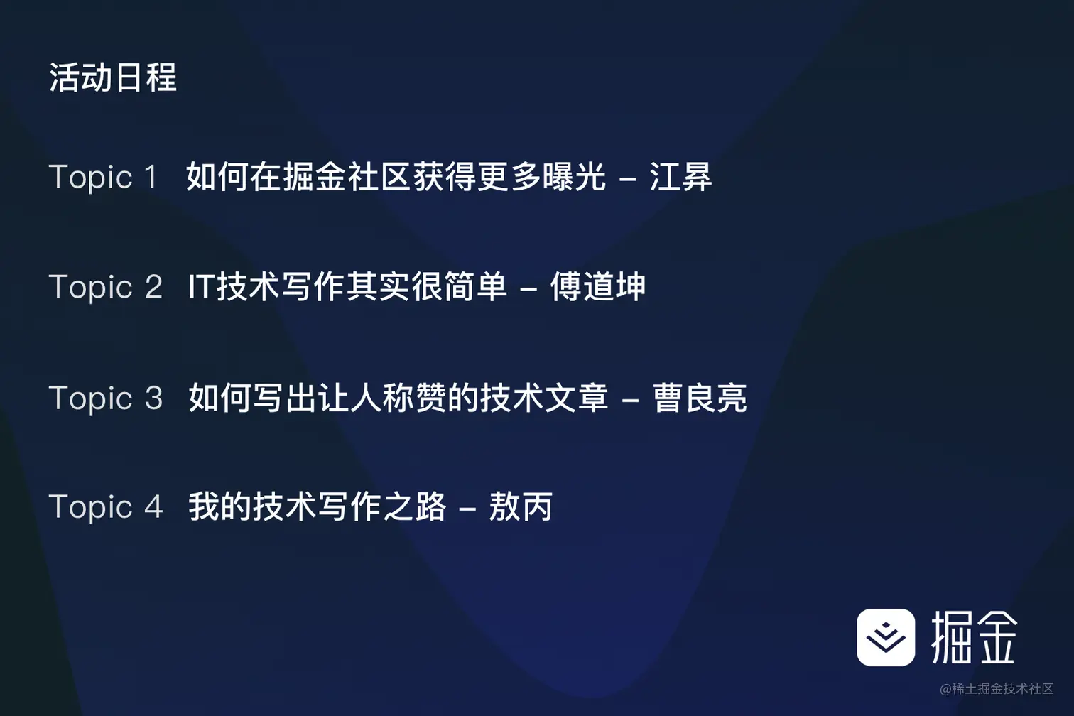 掘力计划致力于激励掘金社区内具备职业身份的个人和技术团队持续输出优质内容、快速成长。创作者训练营活动是由掘金技术社区主办,围绕技术写作主题的系列活动。每期创作者训练营会邀请技术写作领域的优秀技术作者和专业写作人士在线下分享技术写作的相关技巧和干货,来帮助掘友们更好地创作出优质内容。免费参与哟!