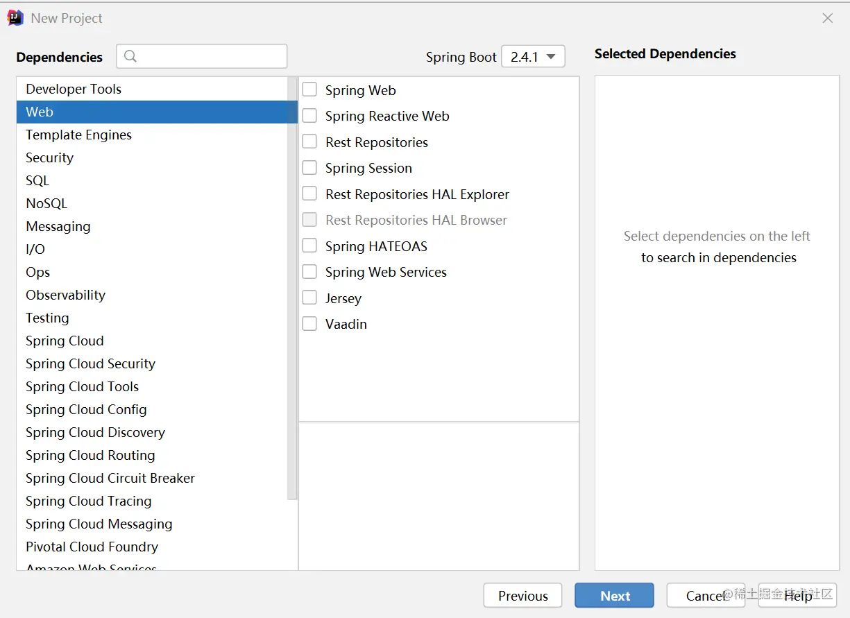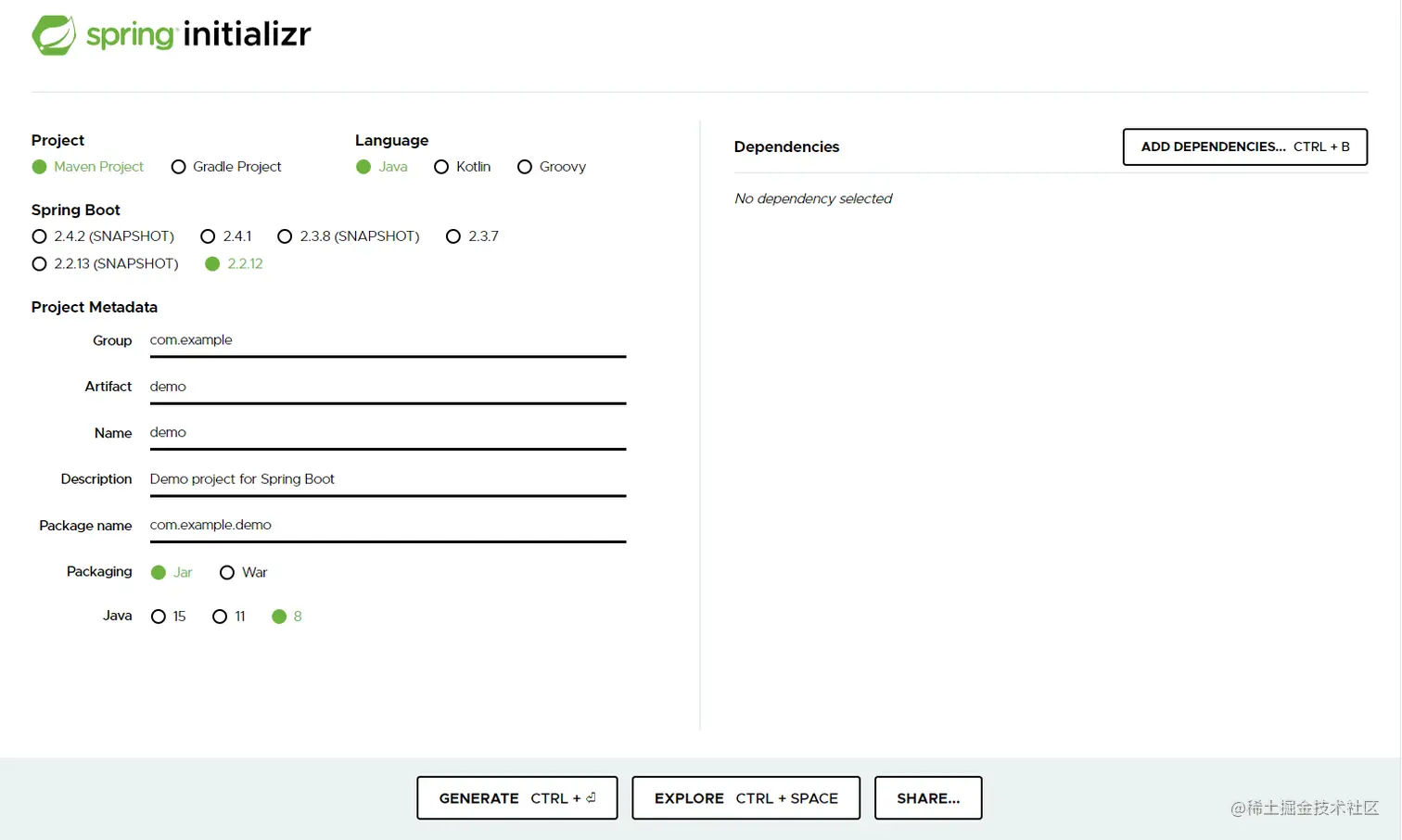 开发工具创建项目本质还是通过上述网站创建,只是创建过程由开发工具完成。下面以IDEA为例说明(也可以在Eclipse中通过STS创建)。