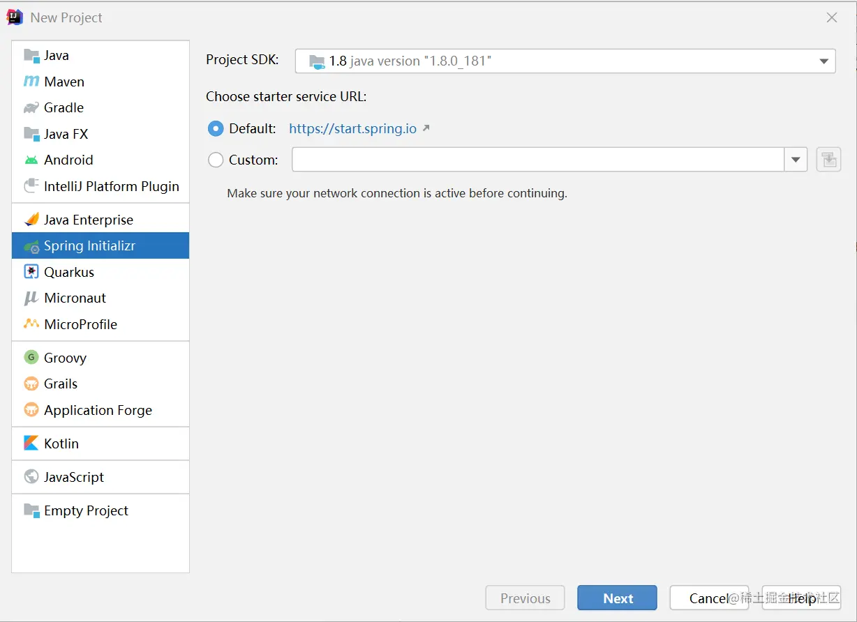 依次选择“File->New->Project”,打开 New Project窗口,左侧选择Spring Initializr,右侧勾选Default(这里就能看出IDEA也是通过官网创建)。